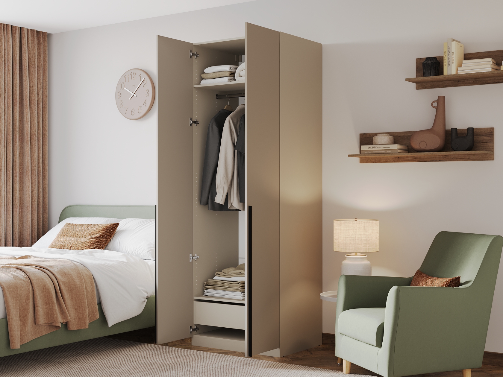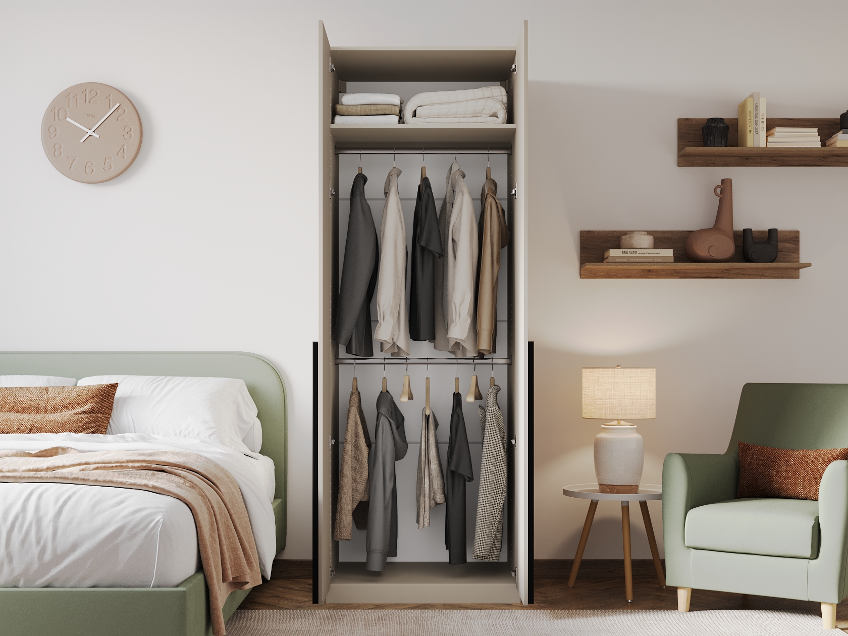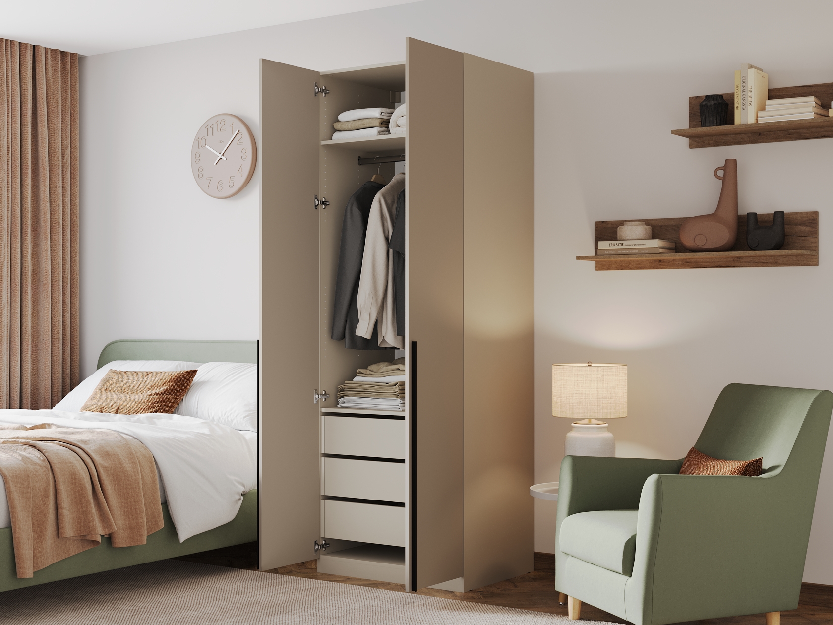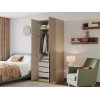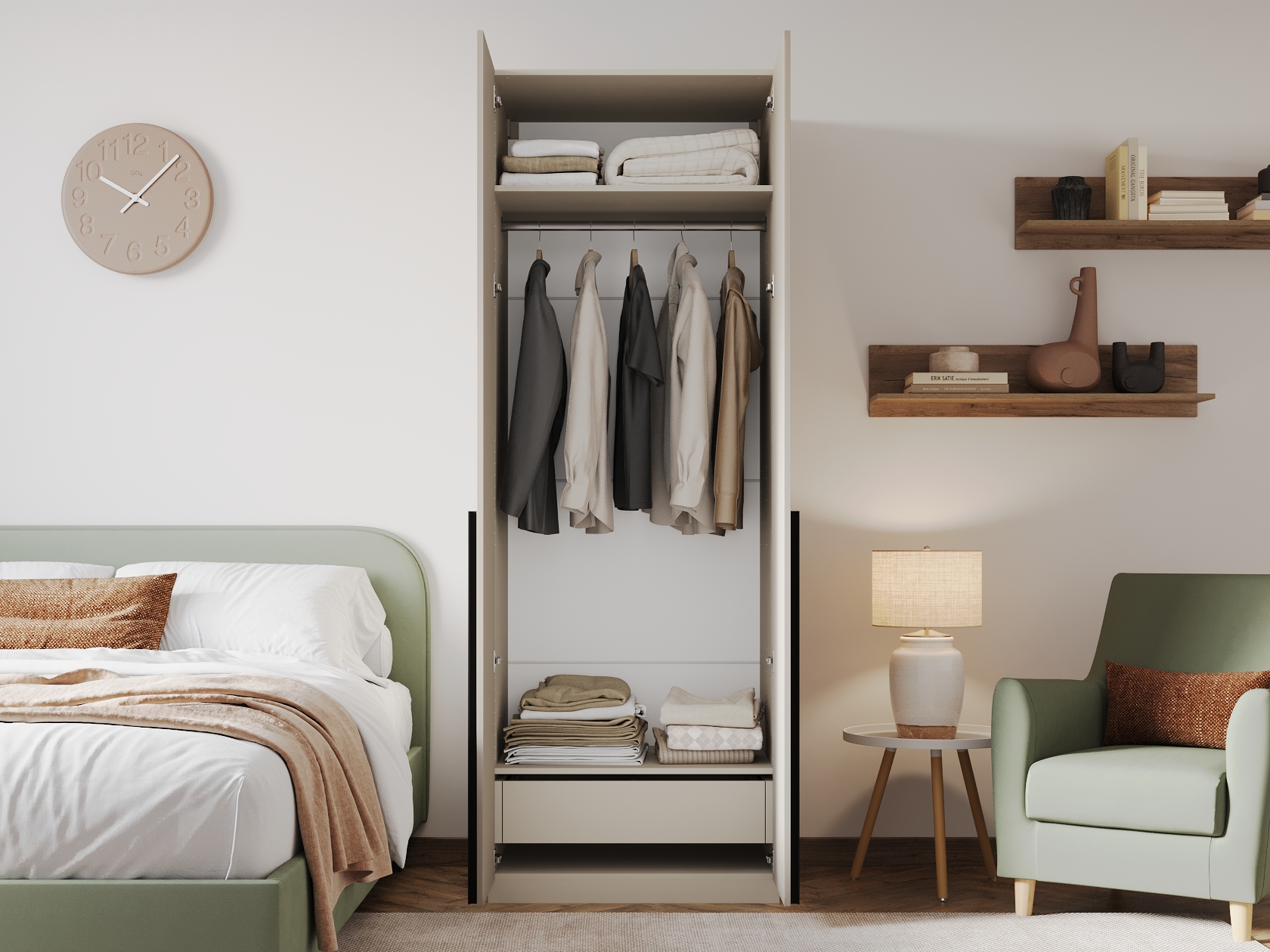 Ниша со штангой расположена на комфортной высоте, что позволяет аккуратно разместить одежду на вешалках, а удобные полки и выдвижные ящики помогают хранить белье, коробки, повседневные и сезонные вещи. За матовыми фасадами с минималистичными ручками легко ухаживать.