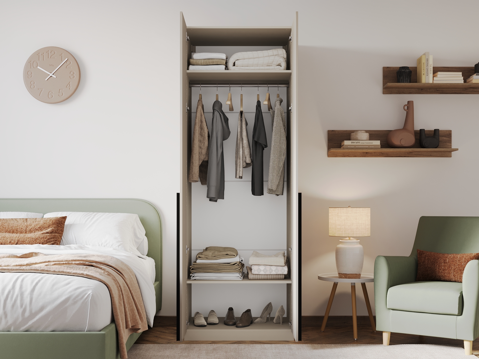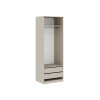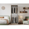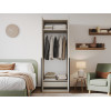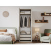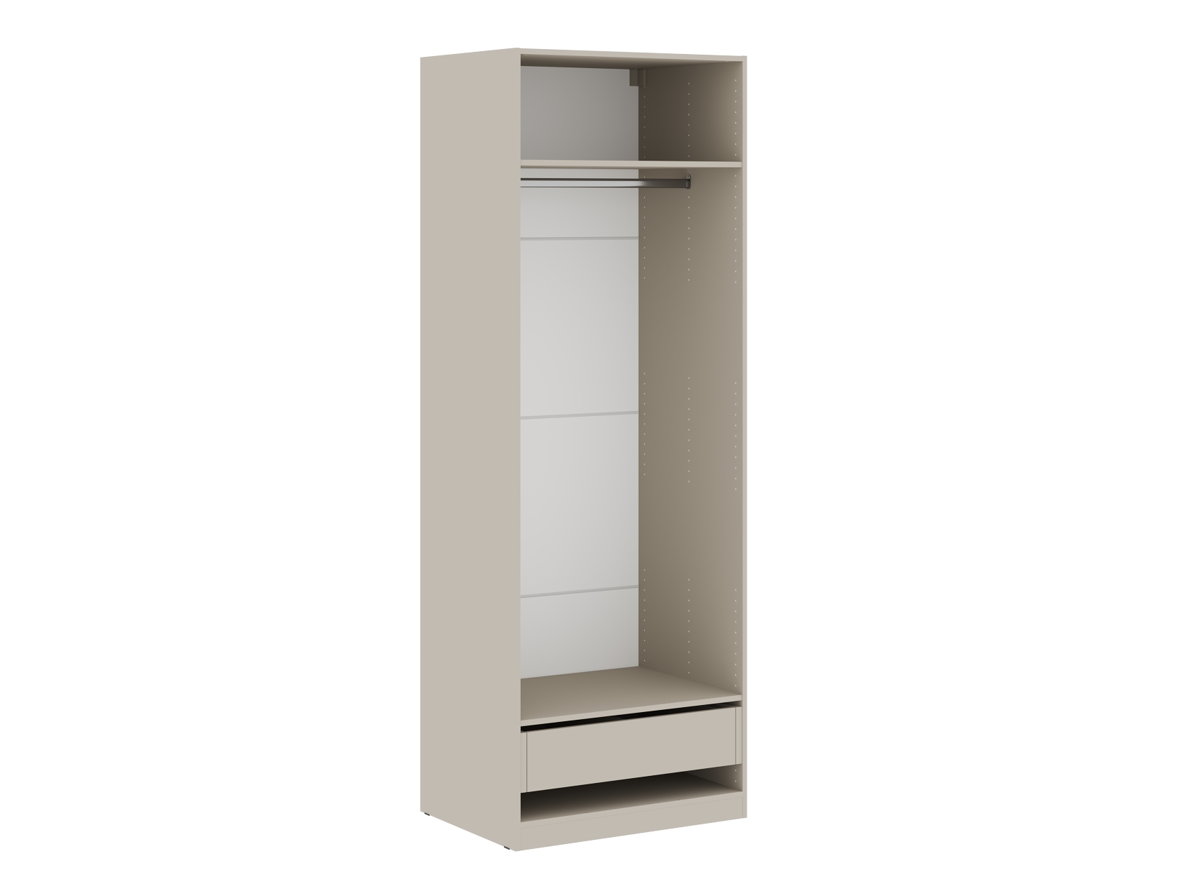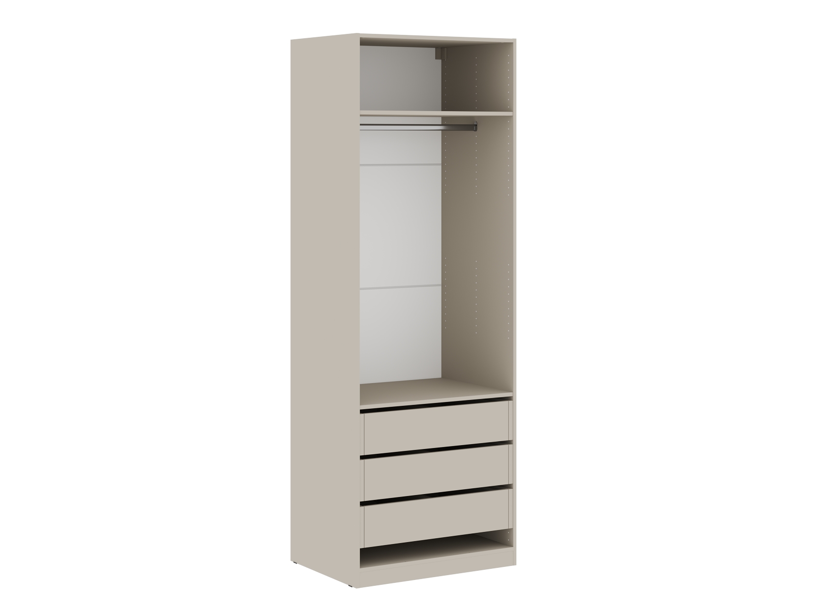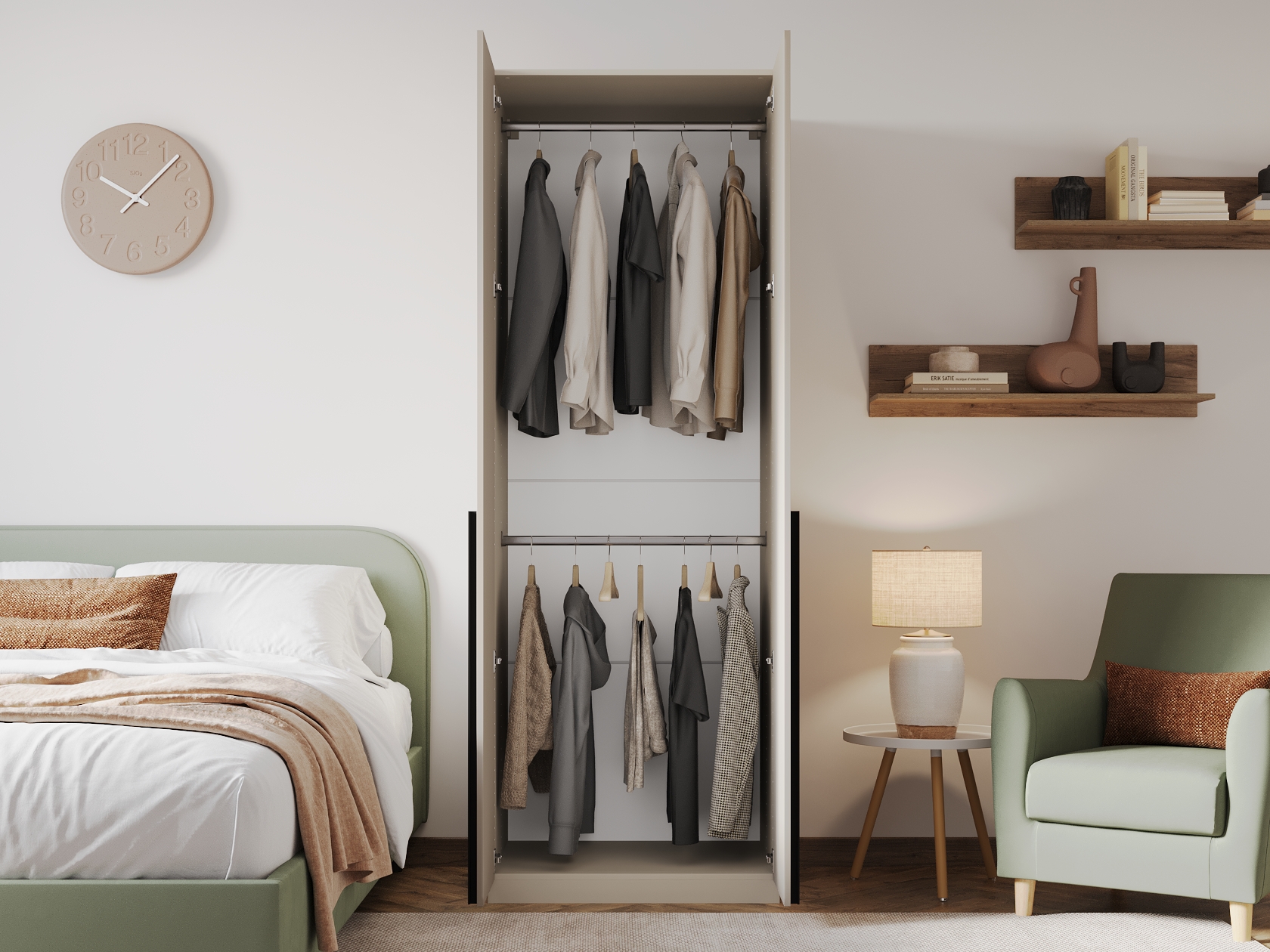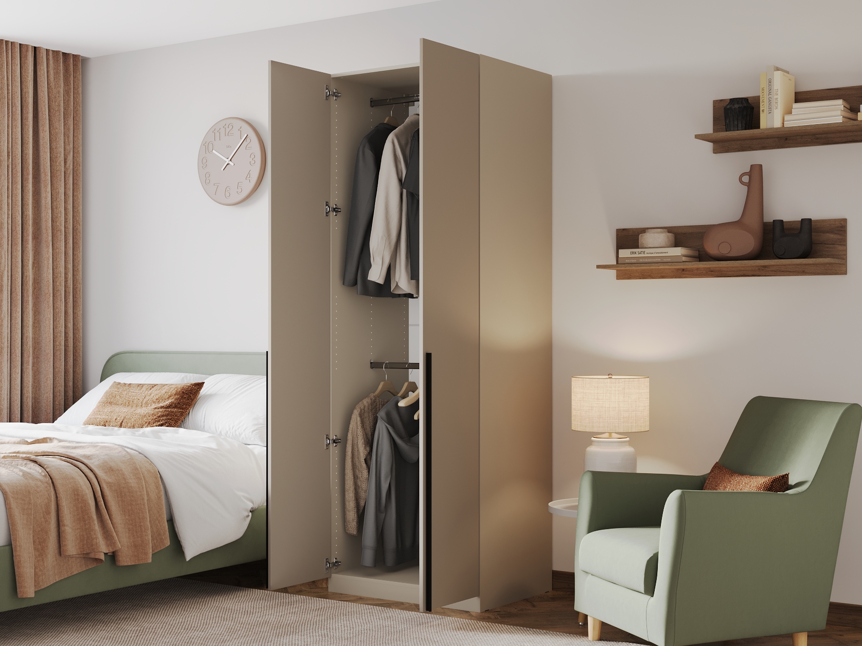Ниша со штангой расположена на комфортной высоте, что позволяет аккуратно разместить одежду на вешалках, а удобные полки и выдвижные ящики помогают хранить белье, коробки, повседневные и сезонные вещи. За матовыми фасадами с минималистичными ручками легко ухаживать.