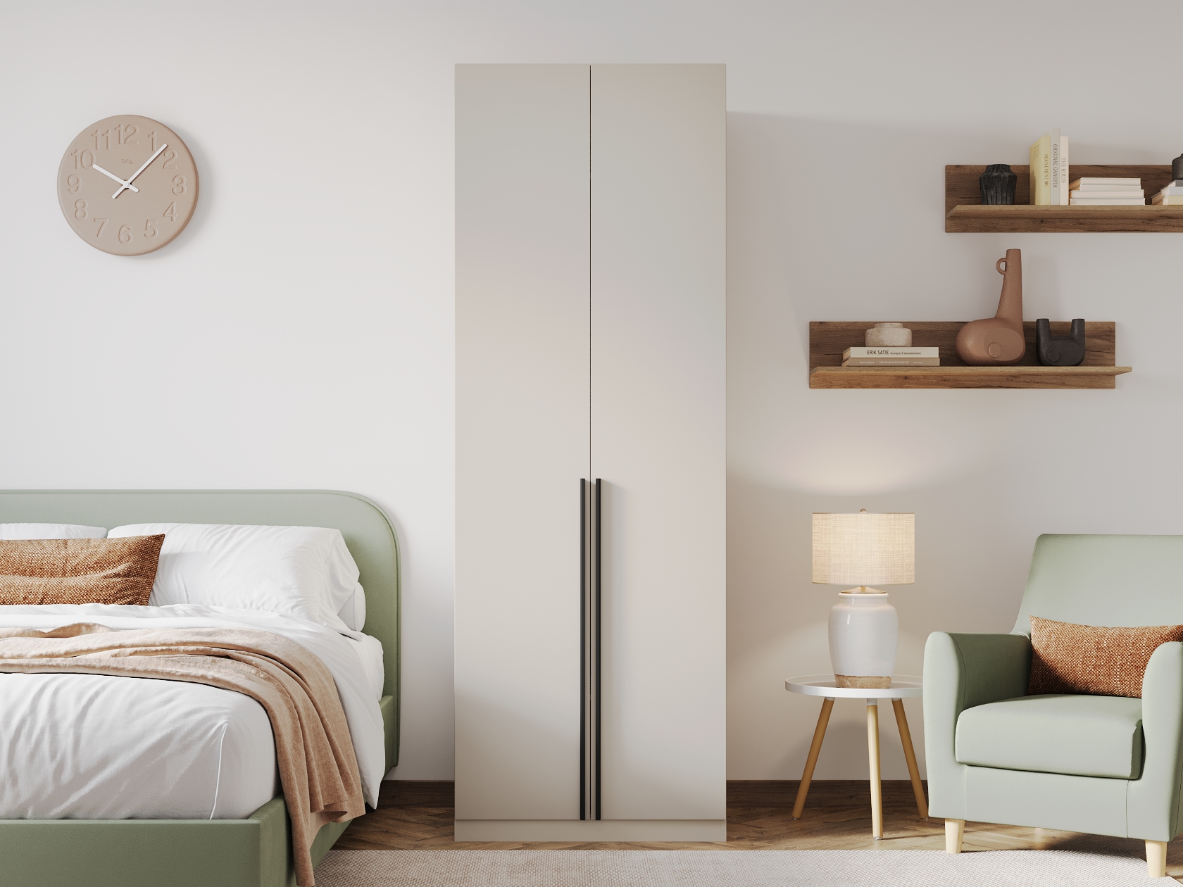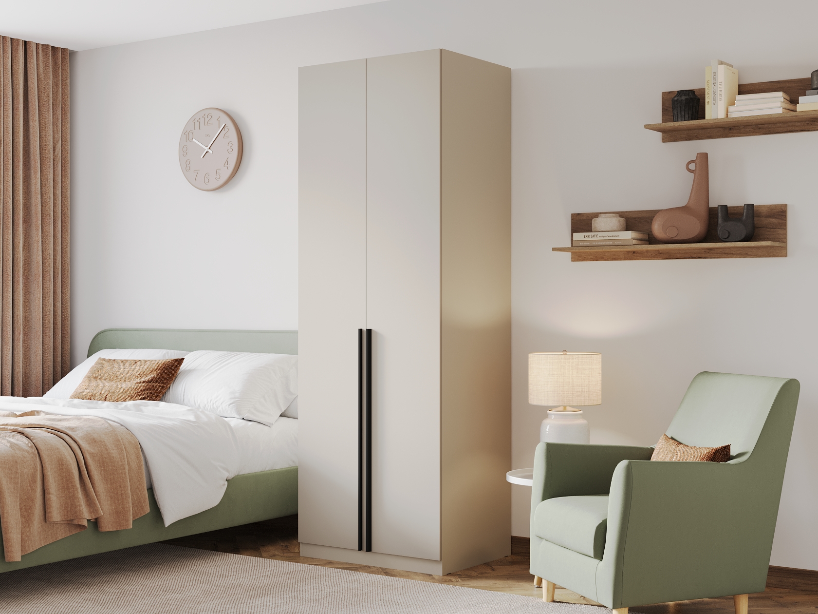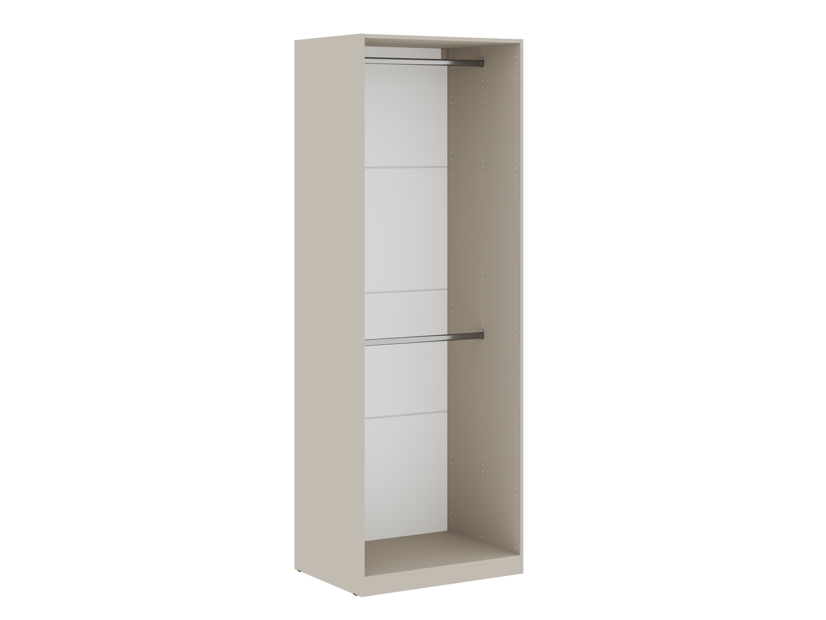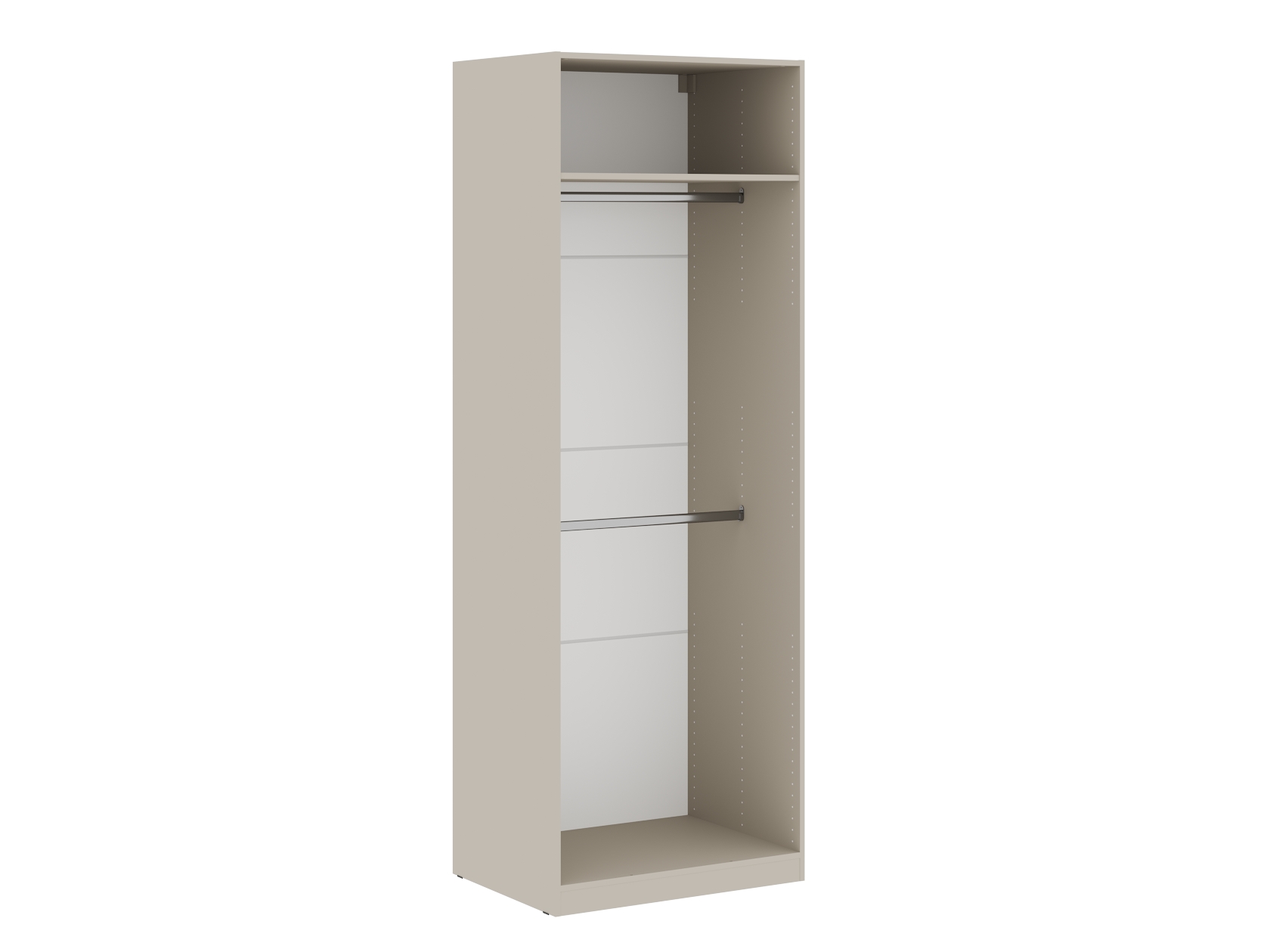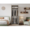 Ниша со штангой расположена на комфортной высоте, что позволяет аккуратно разместить одежду на вешалках, а удобные полки и выдвижные ящики помогают хранить белье, коробки, повседневные и сезонные вещи. За матовыми фасадами с минималистичными ручками легко ухаживать.