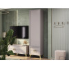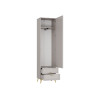 На поперечной штанге удобно расположить одежду на вешалках, а в выдвижных ящиках — распределить белье и полезные мелочи. Полукруглые ручки в оттенке золота делают акцент на объемной фрезеровке фасадов.