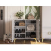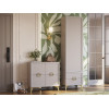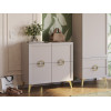 Компактная модель с четырьмя дверцами позволяет разместить на полках одежду, книги и личные вещи. Матовые фасады с рамочной фрезеровкой и фурнитура в оттенке золота делают мебель по-настоящему эффектным дополнением интерьера. Благодаря опорам, расположенным чуть под углом, конструкция смотрится легко и воздушно.
