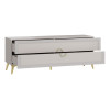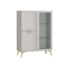 Тумба с изящными золотистыми ножками станет основой под телевизор и другую мультимедийную технику. Функциональные шкафы с витриной и закрытыми секциями идеально подходят для хранения книг, посуды и декора. Матовые фасады с элегантными рамками и стильными ручками придают мебели утонченный вид.