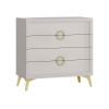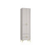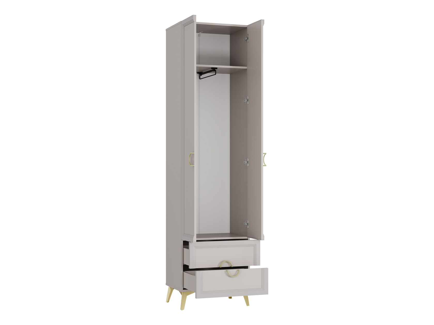 Набор включает практичный шкаф для одежды, низкую банкетку для удобства переобувания и комод с выдвижными ящиками для аксессуаров. Зеркало визуально увеличивает пространство, а мягкие элементы добавляют комфорта. Золотистые акценты фурнитуры и высокие опоры и гармонично дополняют современный интерьер.