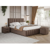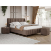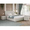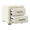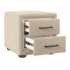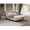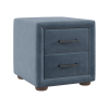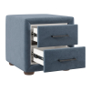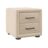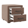 Корпус, полностью обитый мягкой тканью, создает плавный силуэт, а декоративная строчка по периметру фасадов придает модели строгость. Выдвижные ящики обеспечивают быстрый доступ к полезным мелочам: зарядке, футляру для очков, крему для рук. Небольшие опоры дарят тумбе устойчивость на полу с перепадами высоты.