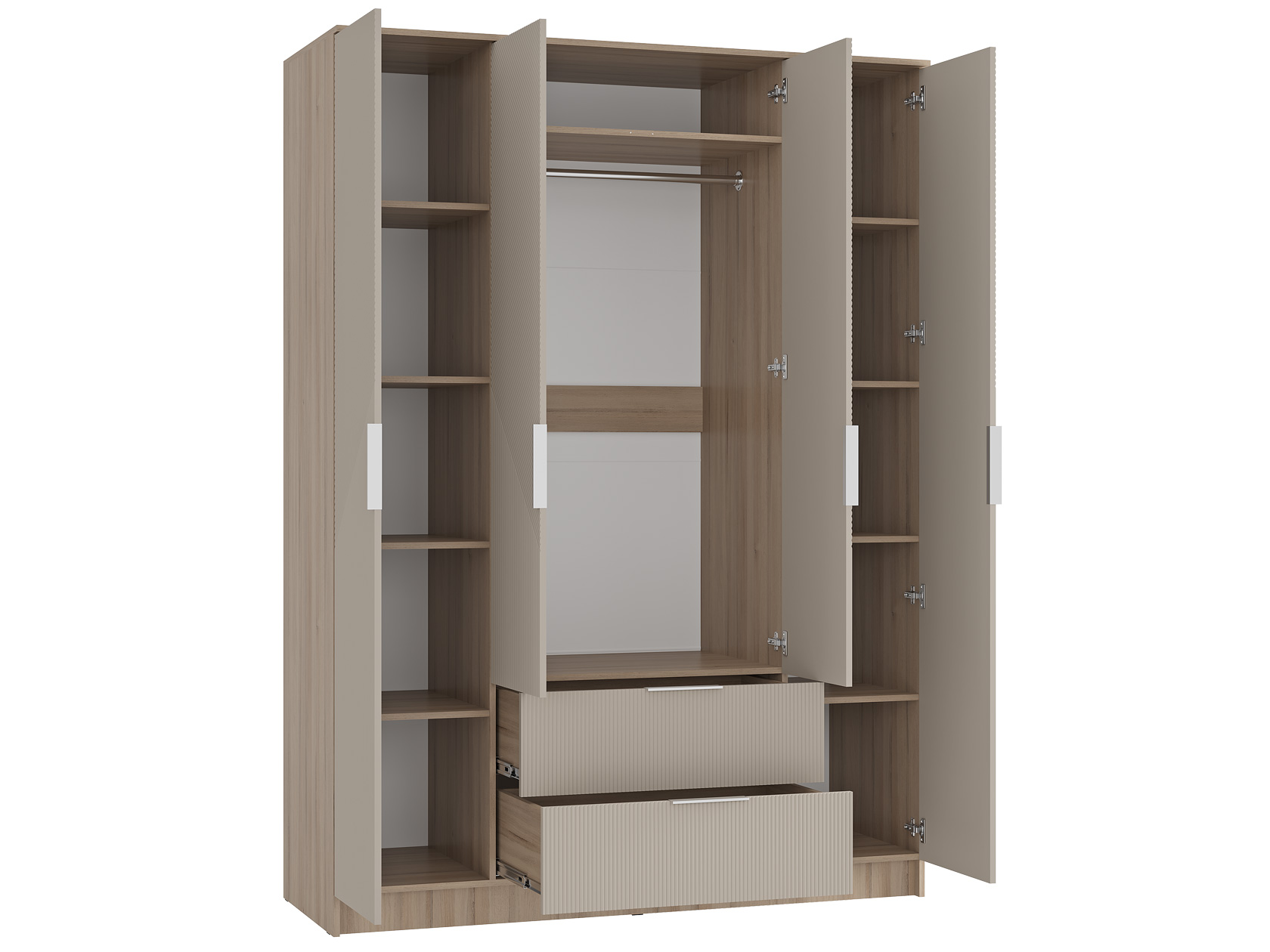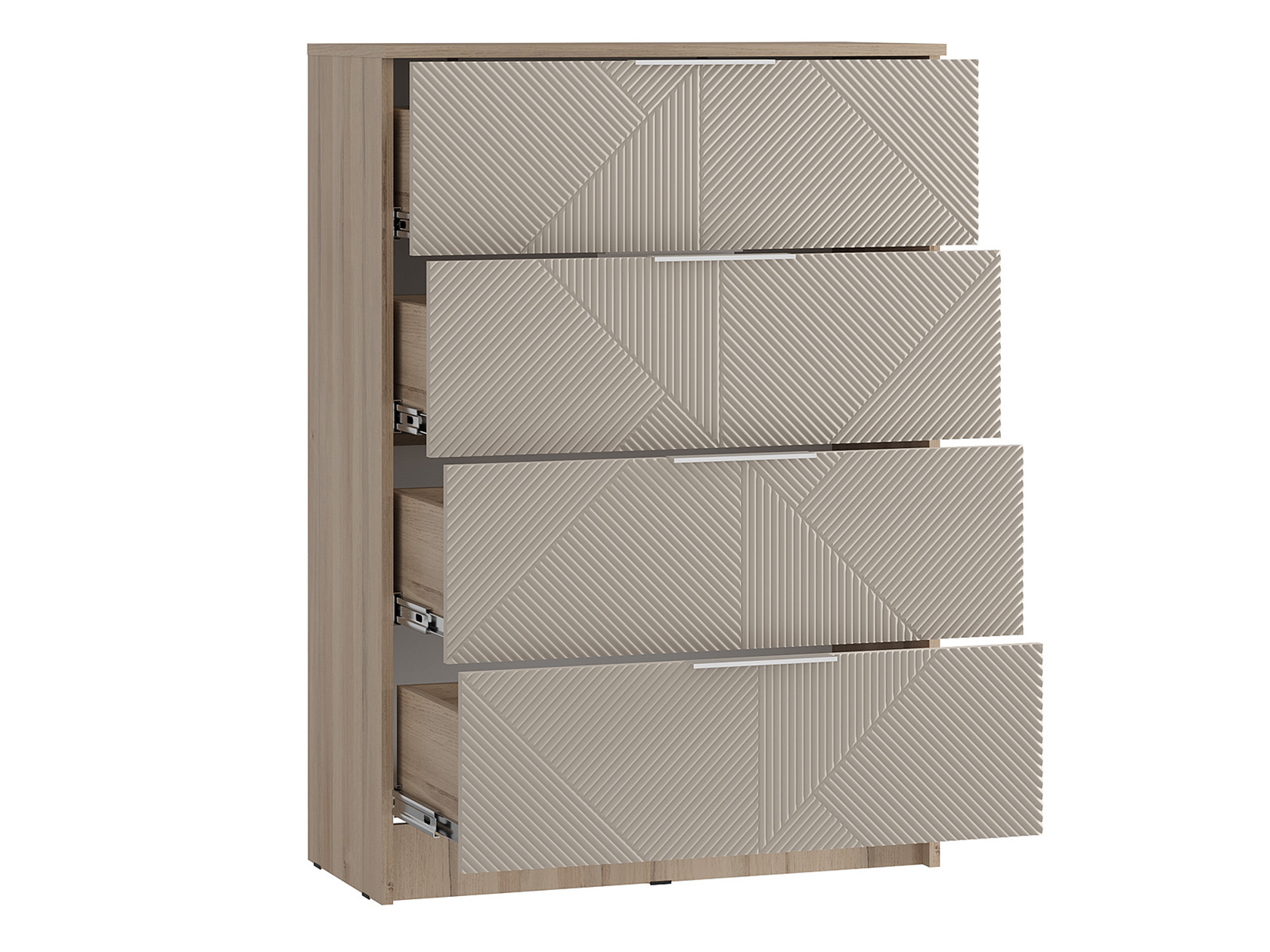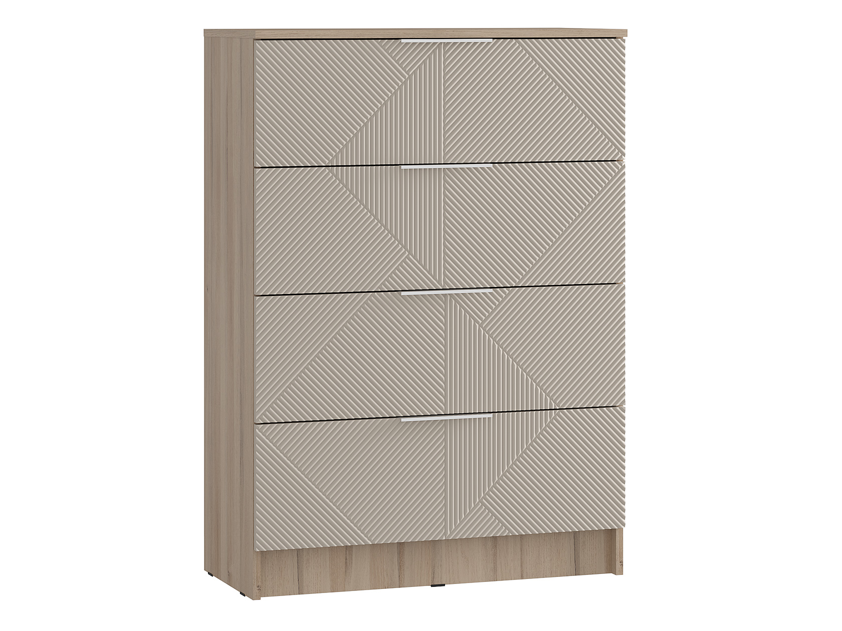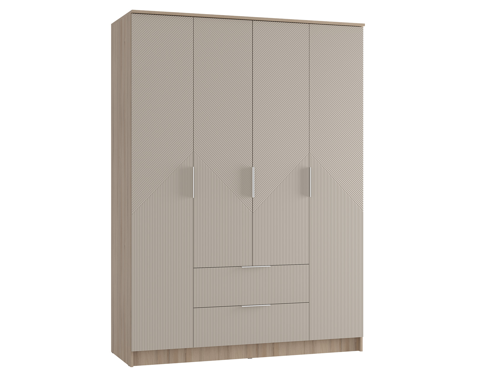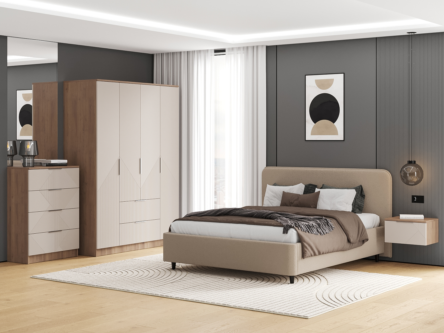 Кровать с высоким мягким изголовьем создаст комфортные условия для чтения и отдыха. Разнообразие зон для хранения позволяет удобно разместить одежду, белье и личные вещи, легко поддерживая порядок. Фактурные фасады с геометрическим узором добавляют обстановке уникальность и особый шарм.